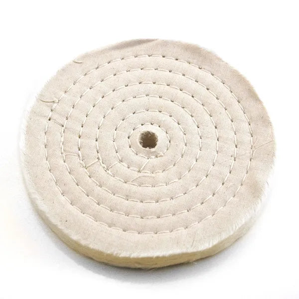 6" X 20 PLY - 1/4" Wide. White Cotton Buffing Wheel, Spiral Sewn Full disc sewn buffs, or spiral sewn buffing wheels are firmer than loose buffs and not as flexible. they are good for buffing on flat or accessible surfaces. They are sewn in a spiral pattern from the center to the edge of the buff. All of the wheels available here in the online store are made with standard 3/8" spiral sewing however we can make these wheels to your specifications by telling us what you want in our Request a Quote form. The LIGHT GAUGE, HIGH POLISH MATERIAL that these wheels are made from is the softest available next to flannel material. This material is for color buffing, high luster work. These wheels are designed to be ganged together on the buffing machine shaft to build the desired thickness of the total buffing head. In other words put as many of these on the shaft to make the wheel as wide as you need it to be. They are a 1/4 inch wide so 4 wheels would make a 1 inch wide head or buff. These white spiral sewn buffs are great for all types of buffing and polishing. They are one of the best all around buffing wheels used on most buffing jobs. If you need a wheel firmer than this for tuff cut buffing, try our yellow spiral sewn buffs. These wheels are good for use with all buffing compounds and polishes including greaseless compound.