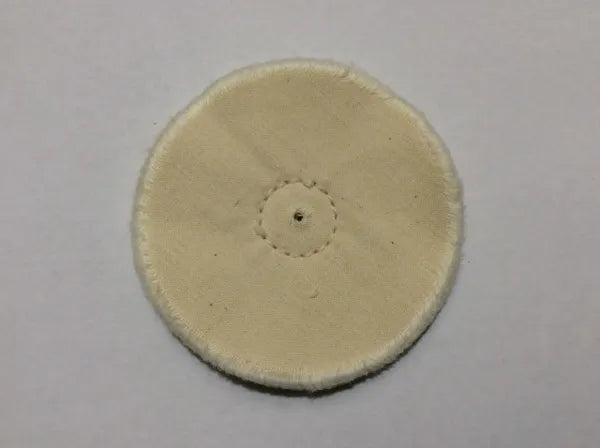 4" X 20 ply Full Disc Loose Buffing Wheel 1/2" or "Pinhole" center hole, 1 row of sewing around center hole. The cotton used to make this wheel is a 60/60 thread count, meaning 60 cotton threads per square inch. This is a soft flexible buff good for buffing or color buffing all types of metal, plastics, wood, and jewelry, This wheel like other full disc loose buffing wheels is good for buffing anything. This is also a perfect jewelry buffing wheel. These buffs are about a ¼" thick and are placed on a straight arbor shaft. The polisher can make the face of the buffing wheel "head" as thick as desired by adding more wheels. Four of these wheels on the buffing shaft would make a "buff head" of 1 inch thick. The pinhole center is for use on a tapered spindle shaft. These buffs work great with all buffing compounds. Loose buffs are good for use with greaseless compounds too. These are great all purpose buffing wheels to have around the shop. They also work well on hand held drill set ups.